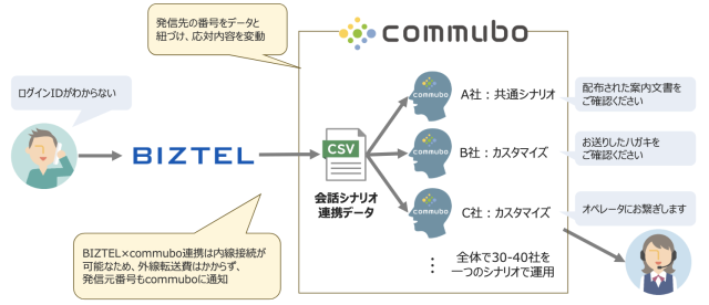 「BIZTEL連携」「柔軟なカスタマイズ性」「運用面も含めた費用対効果」を評価し、commuboを選定。 会話シナリオをcsvデータと連携させることで、数十社規模の運用を一つに集約し、素早い改善と低コスト運用を実現しました。